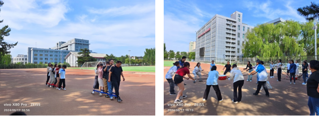 教工第三党支部与研究生党支部、非师范生党支部联合举办了“民族团结一家亲”趣味运动会,师生共计30余人参加了此活动。现场分为合力建塔、合力击鼓、手脚并用、机智连线和共赴前程等5个趣味活动,深深地吸引了师生队员。师生全神贯注、全力以赴,精神抖擞,各显其能,欢乐融洽的气氛在运动场上洋溢。