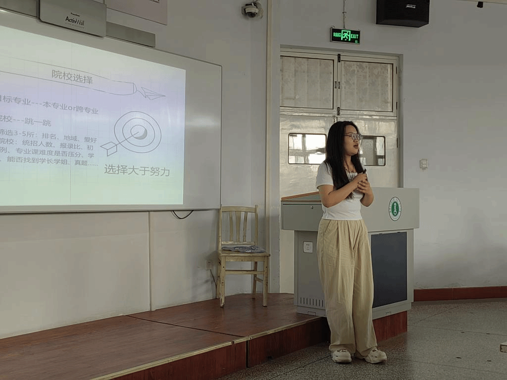 随后,2020级的学生代表任心雨、张羽和周美盈分别从考研院校和专业选择、初试准备、学习过程中的心态调整、复试准备、面试技巧和联系导师等方面分享了他们的经验。他们还推荐了一些有效的学习资源,如核心考案、小程序刷题、大学MOOC、哔哩哔哩和小木虫等,以帮助学弟学妹们更好地备考。