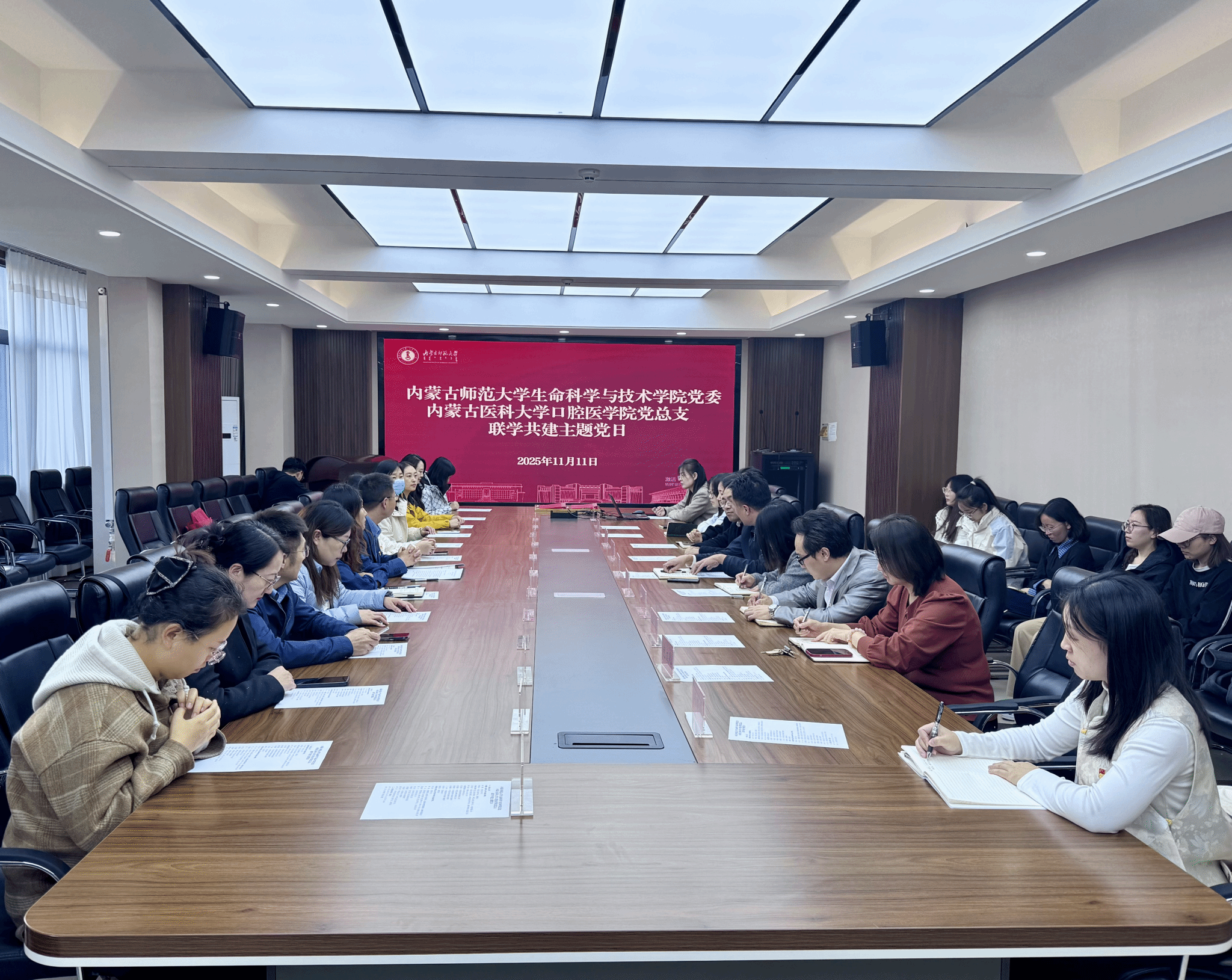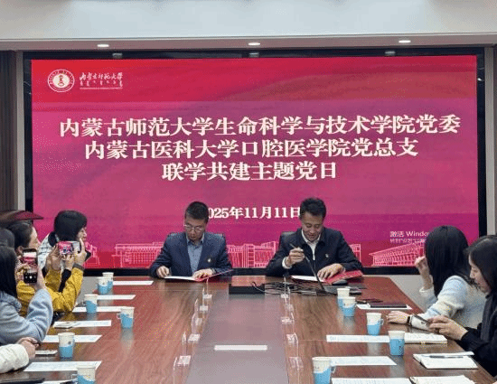 为深入学习贯彻党的二十届四中全会精神,强化基层党组织政治功能与组织功能,探索校际党建共建与学科融合新模式,11月11日下午,内蒙古师范大学生命科学与技术学院与内蒙古医科大学口腔医学院开展联学共建主题党日活动。两院领导班子、党支部书记、科室负责人和部分党员师生代表参加活动。主题党日活动由苏小波主持。