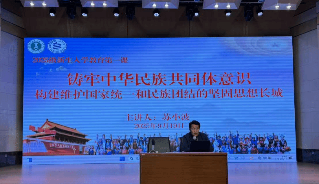 为引导2025级新生树立正确的国家观、历史观、民族观、文化观、宗教观,强化铸牢中华民族共同体意识教育,9月19日上午,学院党委书记苏小波以“铸牢中华民族共同体意识,构建维护国家统一和民族团结的坚固思想长城”为题,为全体新生讲授铸牢中华民族共同体意识教育专题讲座。