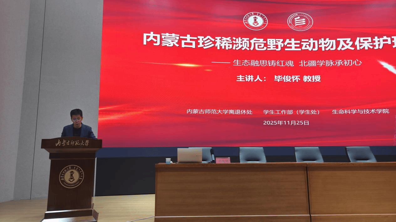 为扎实推进党建与育人工作深度融合,营造良好的学风氛围,2025年11月25日,内蒙古师范大学学生工作部(学生工作处)、离退休教职工工作处联合主办,生命科学与技术学院承办的离退休教授宣讲活动在赛罕校区信息楼学术报告厅举行。本次活动以"生态融思铸红魂,北疆学脉承初心"为主题,邀请毕俊怀教授做了题为《内蒙古珍稀濒危有蹄类动物资源现状与保护》的专题讲座。
